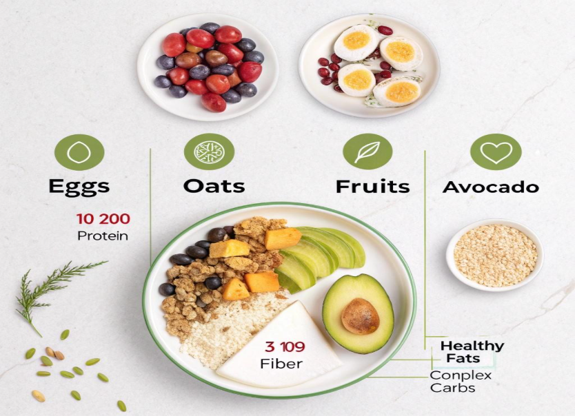 - Fiber 5–10g Oats, chia seeds, fruits, veggies