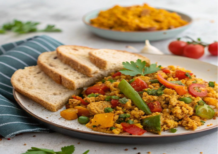 Crumble tofu, sauté with vegetables and spices. Serve with a slice of toast.
