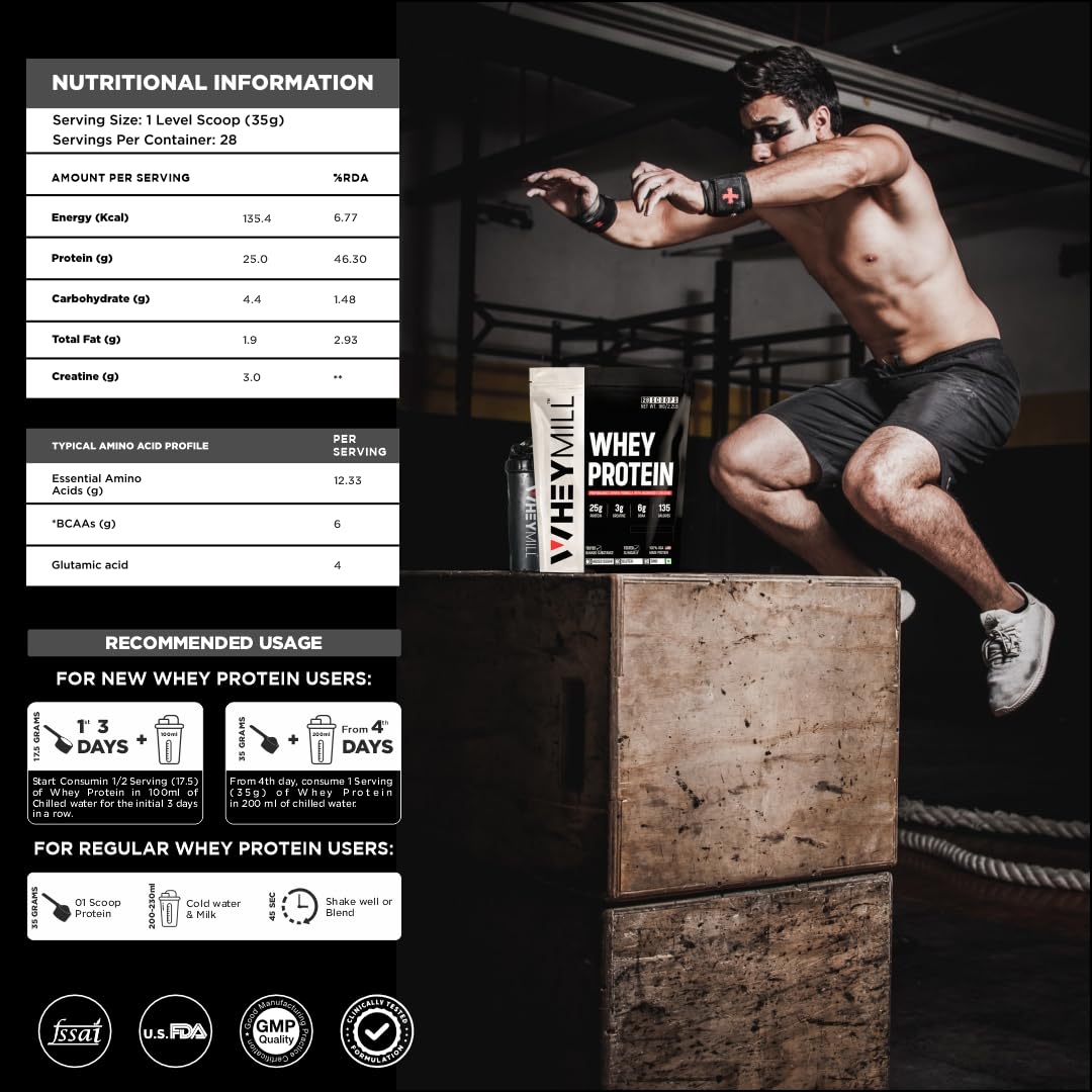 HEAT FREE MICRO FILTRATION PROCESS make its faster digestive, prevents bloating and GI distress.WHEYMILL Whey Protein offers 25g protein/serving, ideal for fitness enthusiast to build lean muscle mass & strength