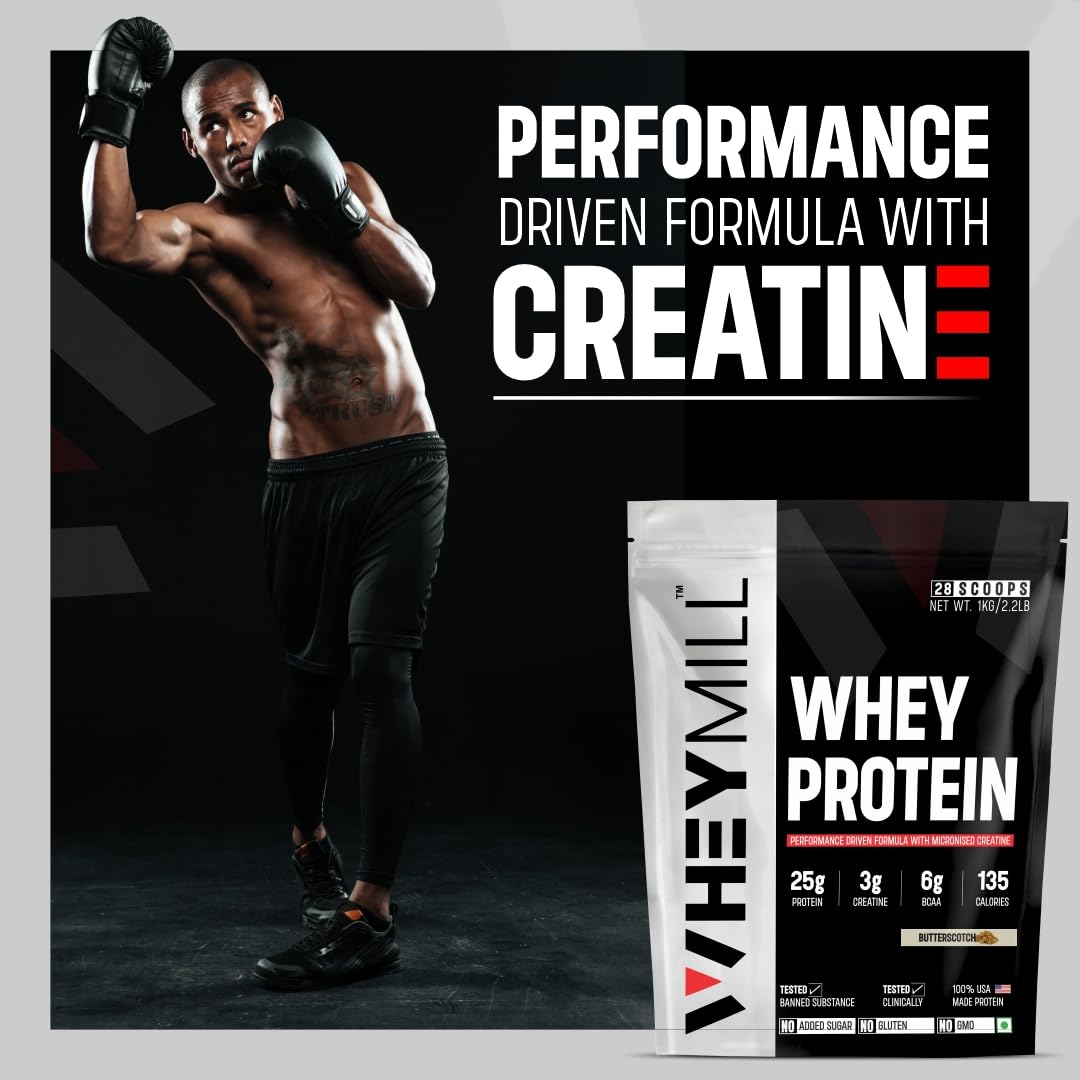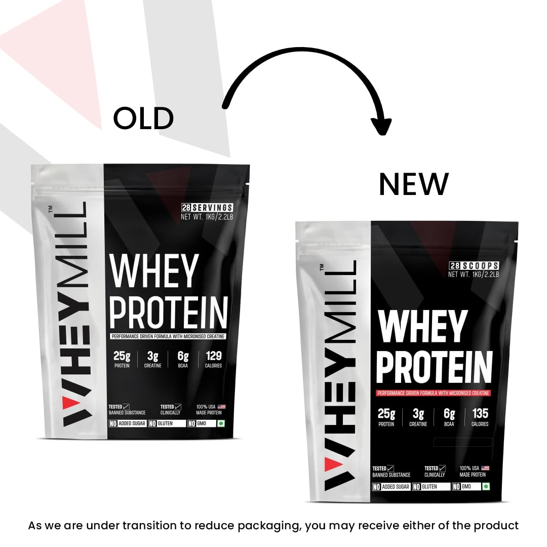 WHEYMILL 100% Whey Protein supplement powder delivers 25g of Pure Protein, 3g Micronized Creatine & 6g BCAA per serving.