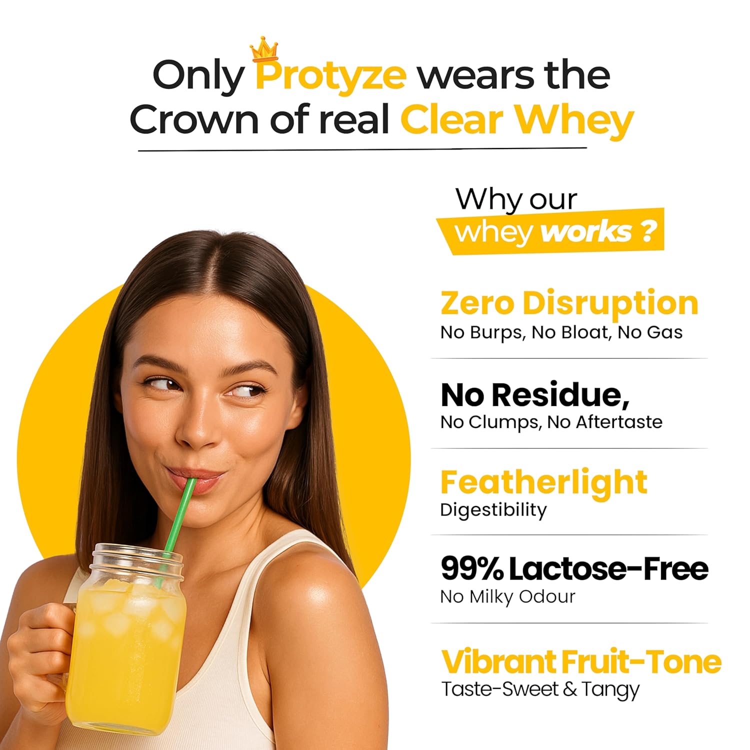 Protyze clear whey is fast-absorbing, 99% lactose-free & has a refreshing, juicy texture, unlike regular whey, which is thicker & milkier—perfect for a light, effective protein boost.