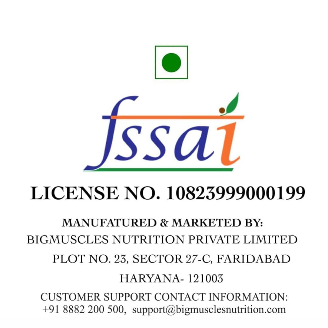 Manufacturer : BIGMUSCLES NUTRITION PRIVATE LIMITED, Plot No. 23, Sector 27C, Faridabad, Haryana, 121003. FSSAI Lic. No. 10823999000199. Support@bigmusclesnutrition.com. +91 8882 200 500.
