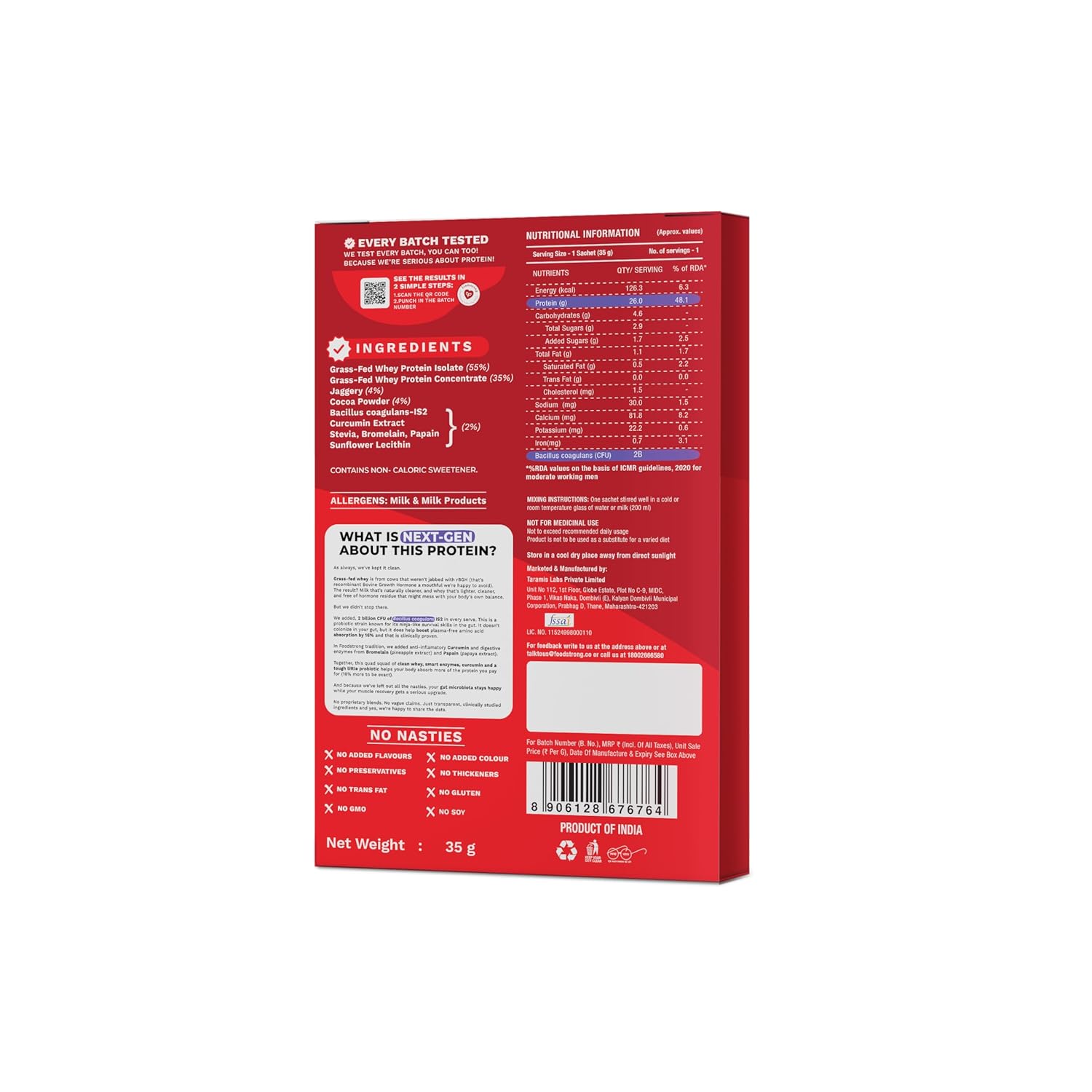 Packer : Taramis Labs Private Limited, 104 , New Udyog Mandir 2, 7/c Pitambar Lane, Mahim, Mumbai 400016, Contact: 18002666580, Email: talktous@foodstrong.co