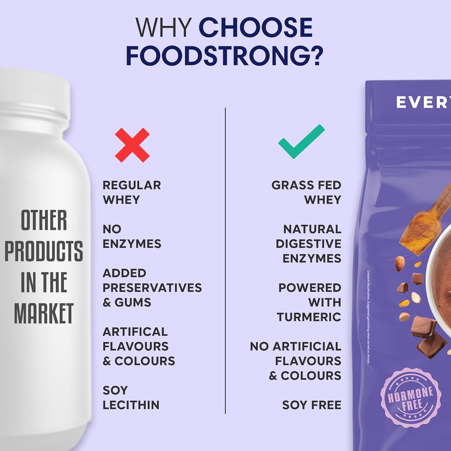 I’ve tried quite a few whey protein brands over the years, but Foodstrong Grass Fed Whey Protein really stands out!✅ Amazing Variety of Flavours – The box comes with 6 exciting flavours: Chocolate Almond, Cookies & Cream, Malai Kulfi, Vanilla, Coffee, and Mango. Every flavour tastes fresh and natural, without that artificial aftertaste you often get with protein powders. My personal favourites are Malai Kulfi and Coffee – such a nice change from the usual chocolate/vanilla!✅ High-Quality Nutrition – Each serving packs 24g of protein and 6.6g of BCAA, perfect for muscle recovery after workouts. I also love that it’s hormone-free and made from grass-fed whey, which feels much cleaner and healthier.✅ Easy to Mix – The powder blends effortlessly in water or milk without clumps, and the texture is smooth. I sometimes add it to smoothies for an extra protein boost.✅ Perfect for Portion Control – With 6 individual servings, it’s super convenient to carry and ensures freshness in every pack.If you’re looking for a protein powder that’s delicious, clean, and effective, this is a fantastic choice. Highly recommended for fitness lovers who also care about taste and quality!