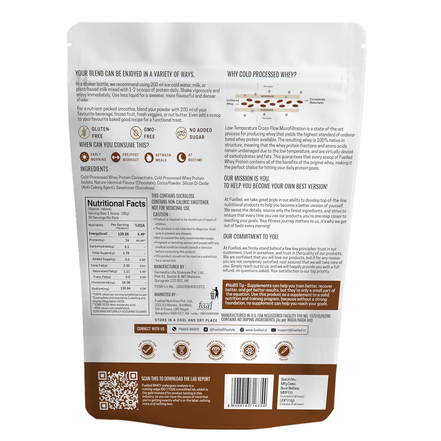 COLD PROCESSED WHEY PROTEIN: Fuelled Whey Protein is strictly low-temperature processed whey protein that ensures undamaged aminos for maximum benefit of original whey protein.