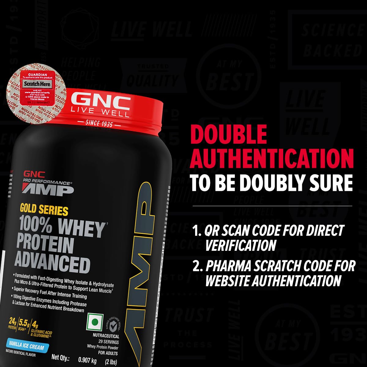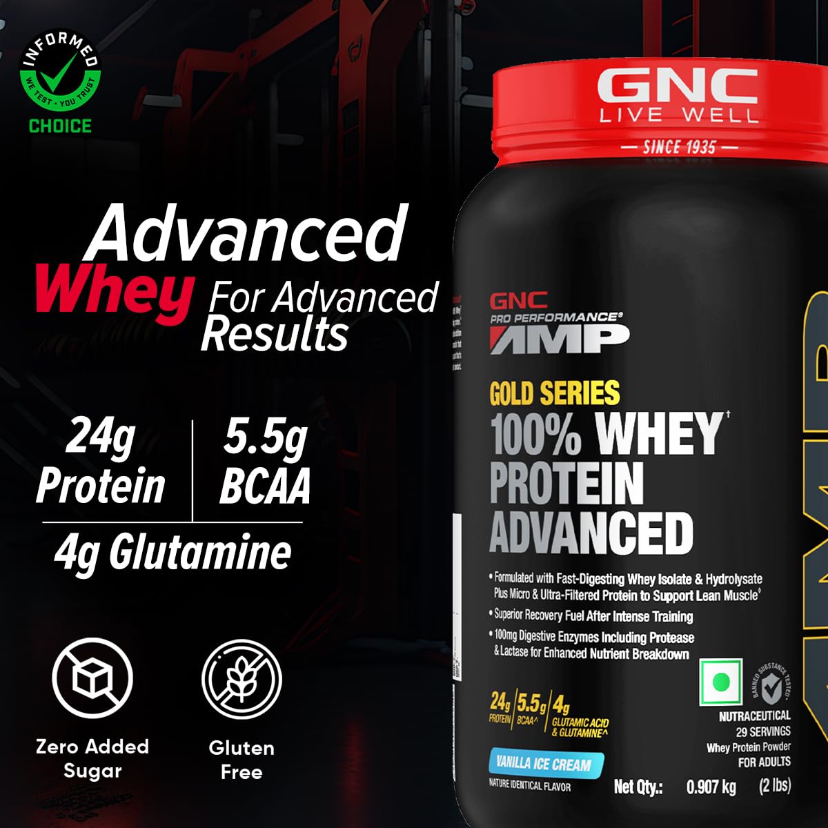 Generic Name : GNC AMP Gold Series 100% Whey Protein Advanced | Lean Muscle Gains | Advanced Fitness Performance | Formulated In USA | 24g Protein | 5.5g BCAA | 4g Glutamine | Vanilla Ice Cream | 2 lbs