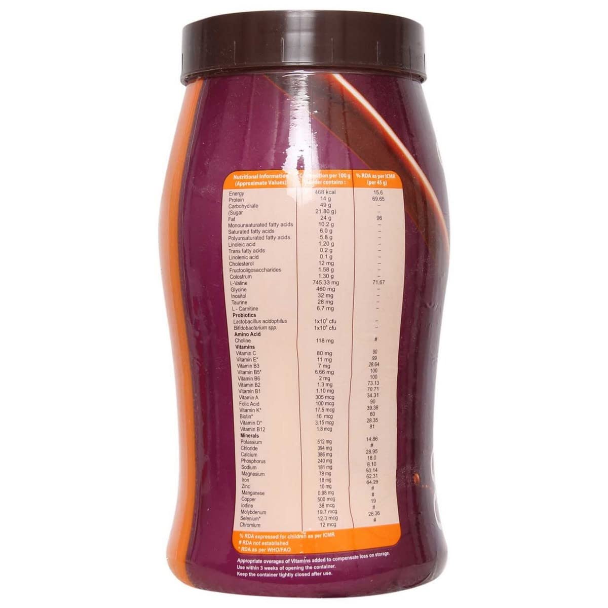 Composition: Whole Milk Powder, Sugar, High Oleic Sunflower Oil Powder, Whey Protein Concentrate, MCT Fat Base Powder, Alkalized Cocoa Powder, Fructooligosaccharides, Colostrum, Tribasic Calcium Phosphate, Choline Bitartrate, Cream Plus, Sodium Citrate Dihydrate, Dipotassium Hydrogen Phosphate, magnesium Oxide, Lactobacillus Acidophilus, Bifidobacterium Bifidum, Sodium Chloride, L-Ascorbic Acid, Ferric Pyrophosphate, Inositol, Taurine, Zinc Sulphate, Monohydrate, DL-Alpha Tocopheryl Acetate, Ethyl Cellulose (INS 462), L-Carnitine L-Tartrate, Calcium D Pantothenate, Niacinamide, Retinyl Acetate, Pyridoxine HCl, Manganese Sulphate Monohydrate, Riboflavin Sodium Phosphate, Copper Sulfate Pentahydrate, Thiamine HCl, Phytomenadione, Cyanocobalamin, N-Pteroyl-L-Glutamic Acid, Chromium Trichloride, Hexahydrate, Sodium Molybdate Dihydrate, Potassium Iodide, Sodium Selenite Anhydrous, Biotin, Argocalciferol.. This product will have minimum 6 months’ expiry at the time of order dispatch.