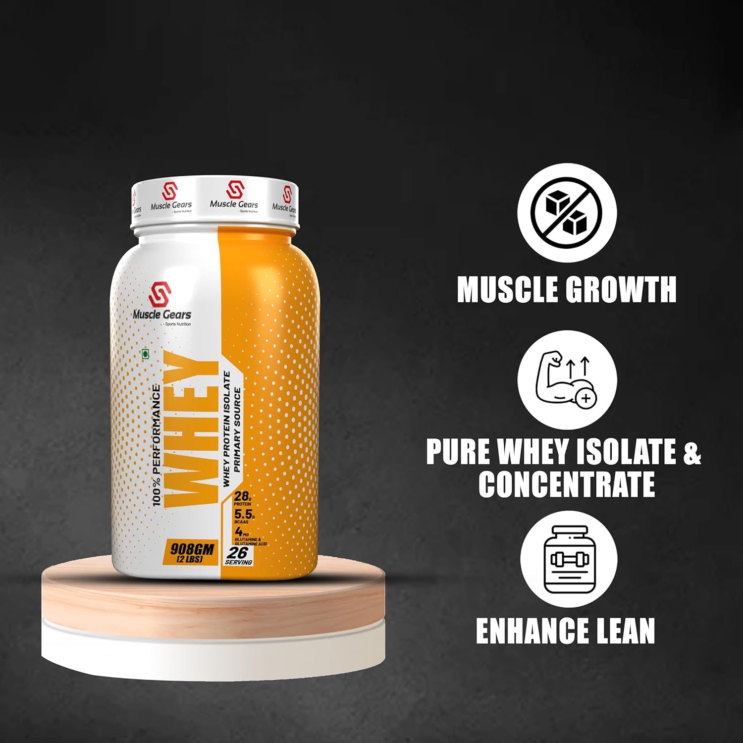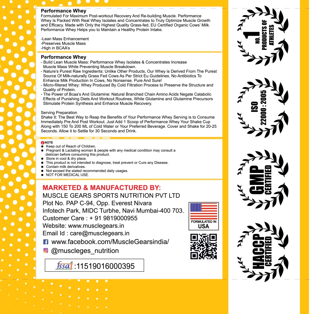 Muscle Gears Performance Whey Protein Powder is the purest form of whey protein. Whey protein isolate is quickly absorbed by the body, making it the ideal choice for people who are looking to build muscle, recover from workouts, or maintain weight.