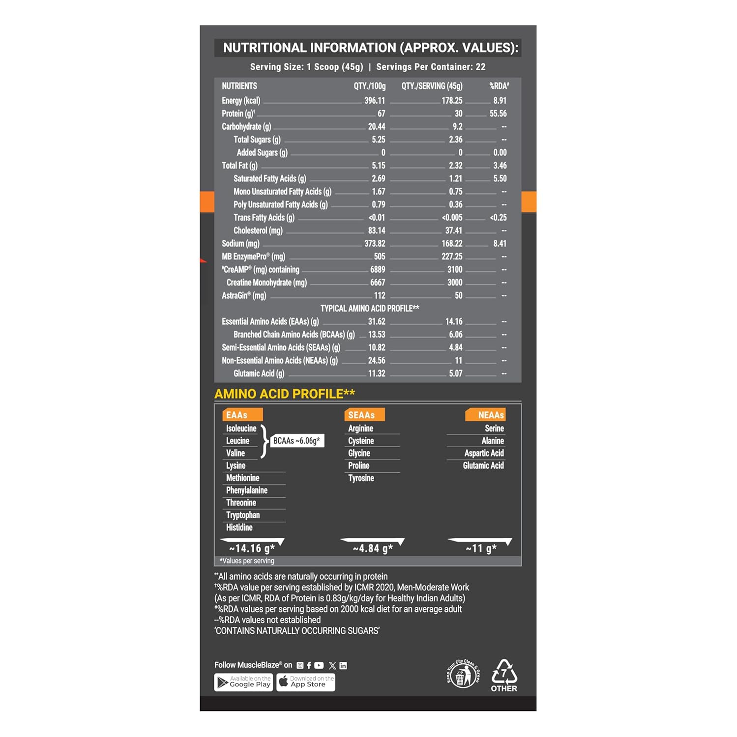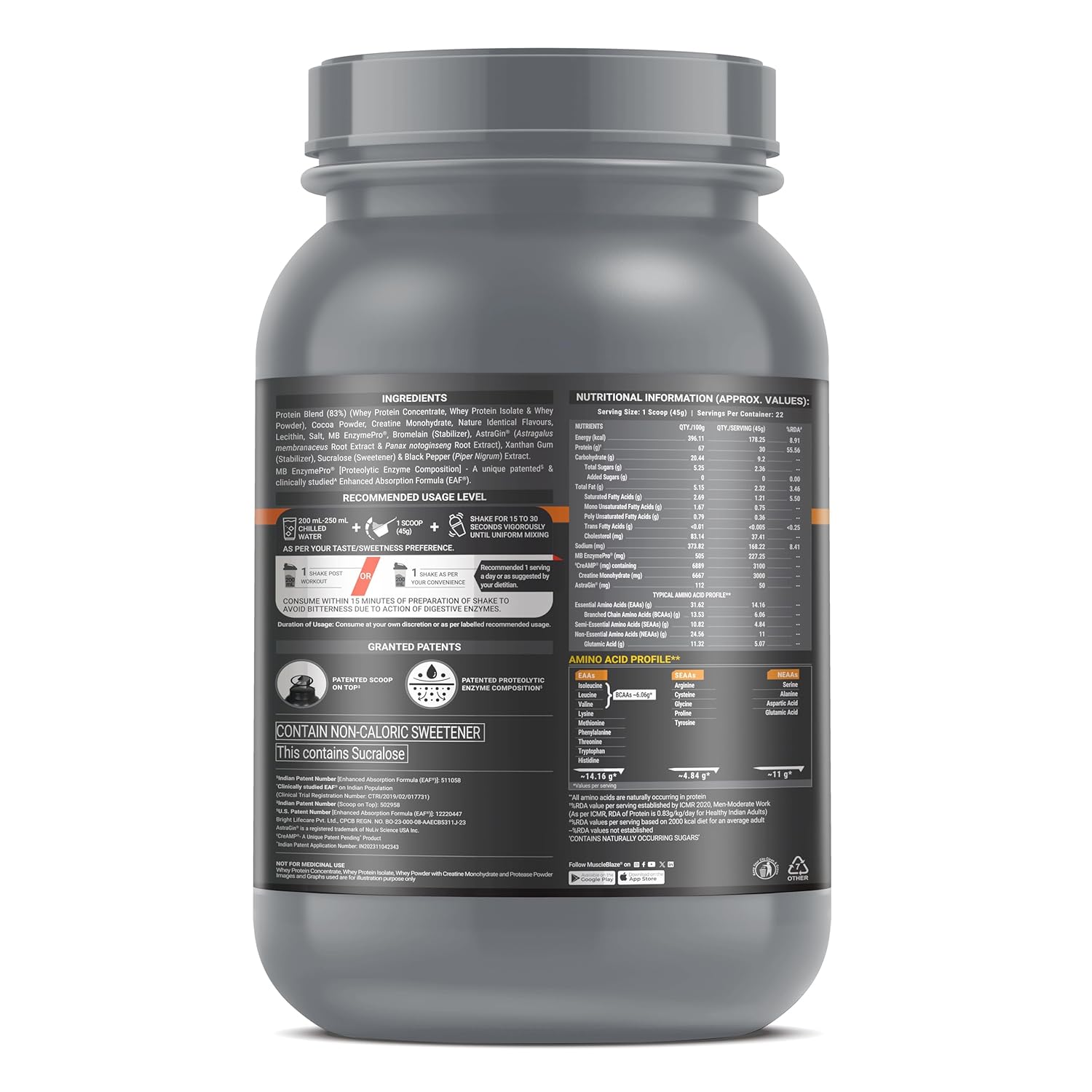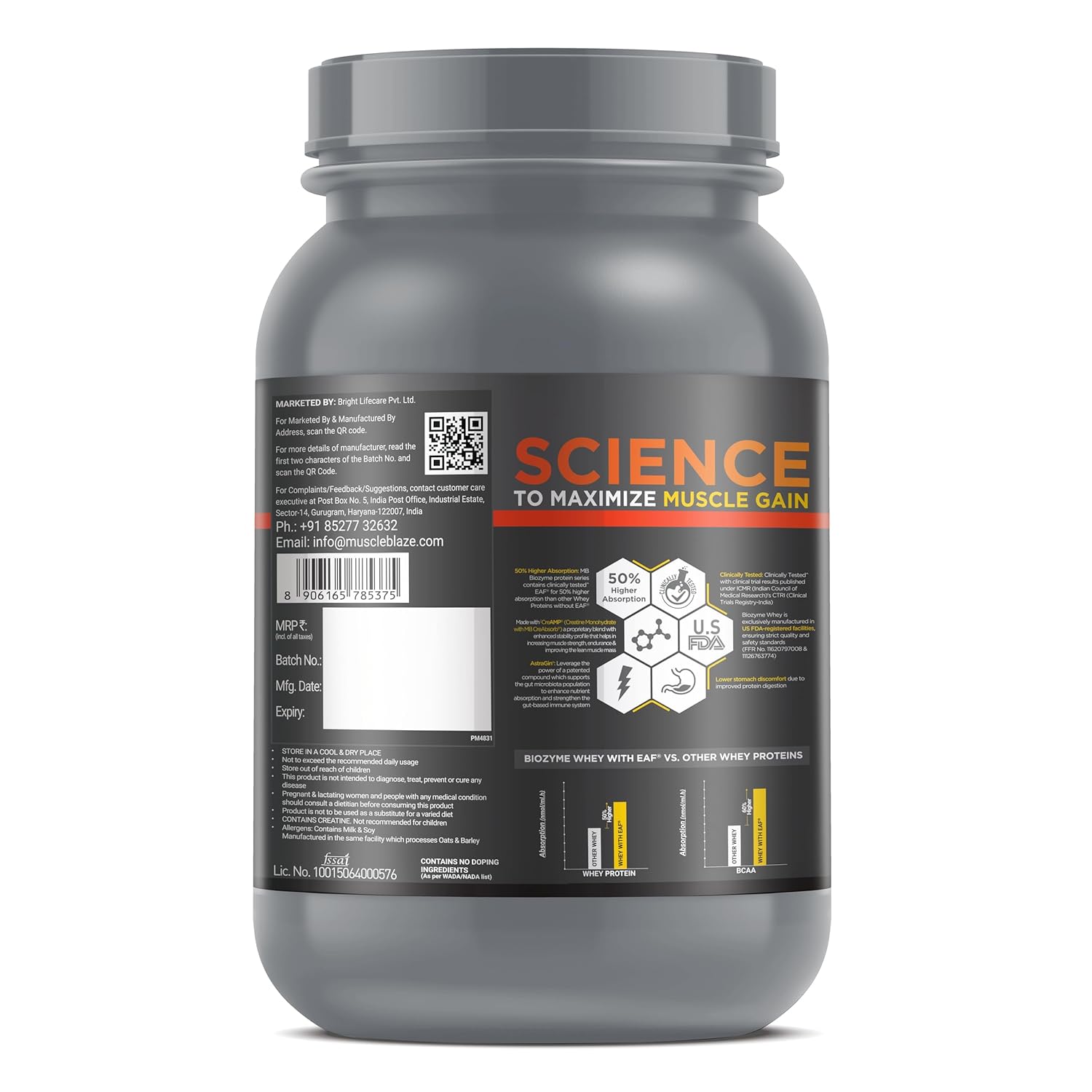 ENHANCED ABSORPTION FORMULA (EAF): MuscleBlaze Biozyme Whey ensures 50% HIGHER PROTEIN ABSORPTION compared to other whey proteins. This proprietary formulation of MB is internationally patent-applied & lowers any possible protein digestion issues
