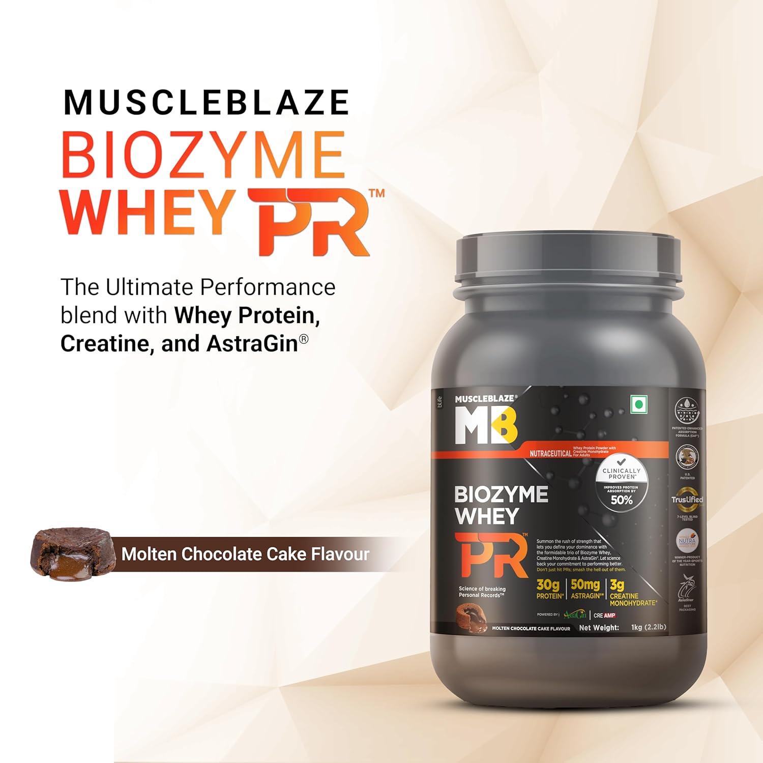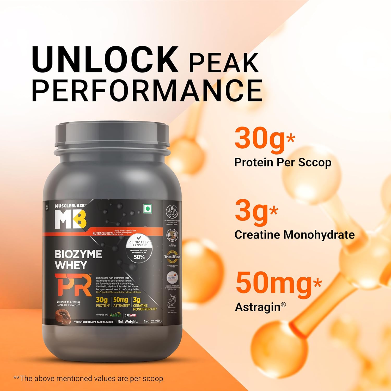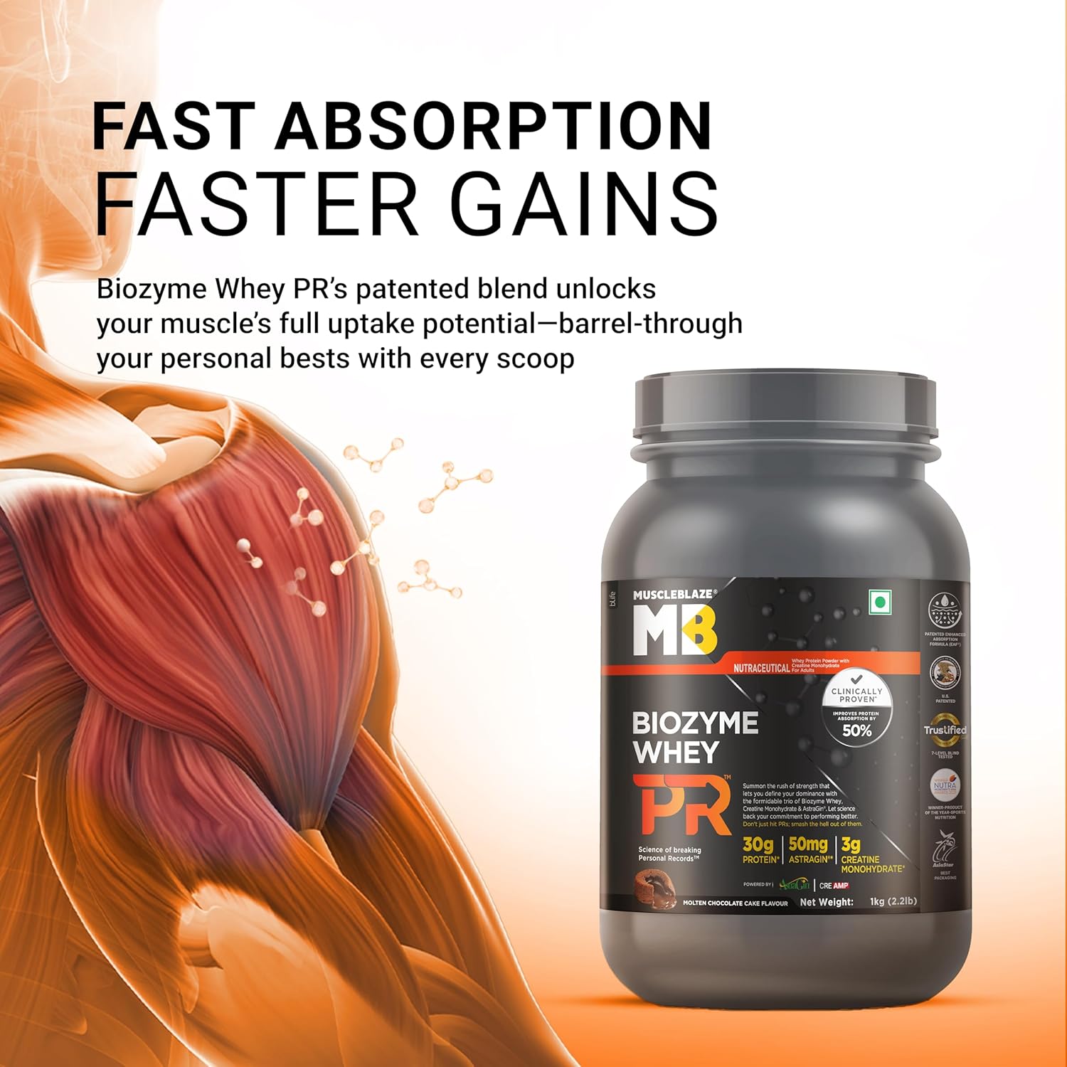 30g PROTEIN, 3g CREATINE MONOHYDRATE & 50mg ASTRAGIN: MuscleBlaze Biozyme Whey PR delivers all this per scoop powered by all-imported, highest grade, international quality Isolate & concentrate whey protein blend. Powerful trio lets you perform better & helps you break personal records