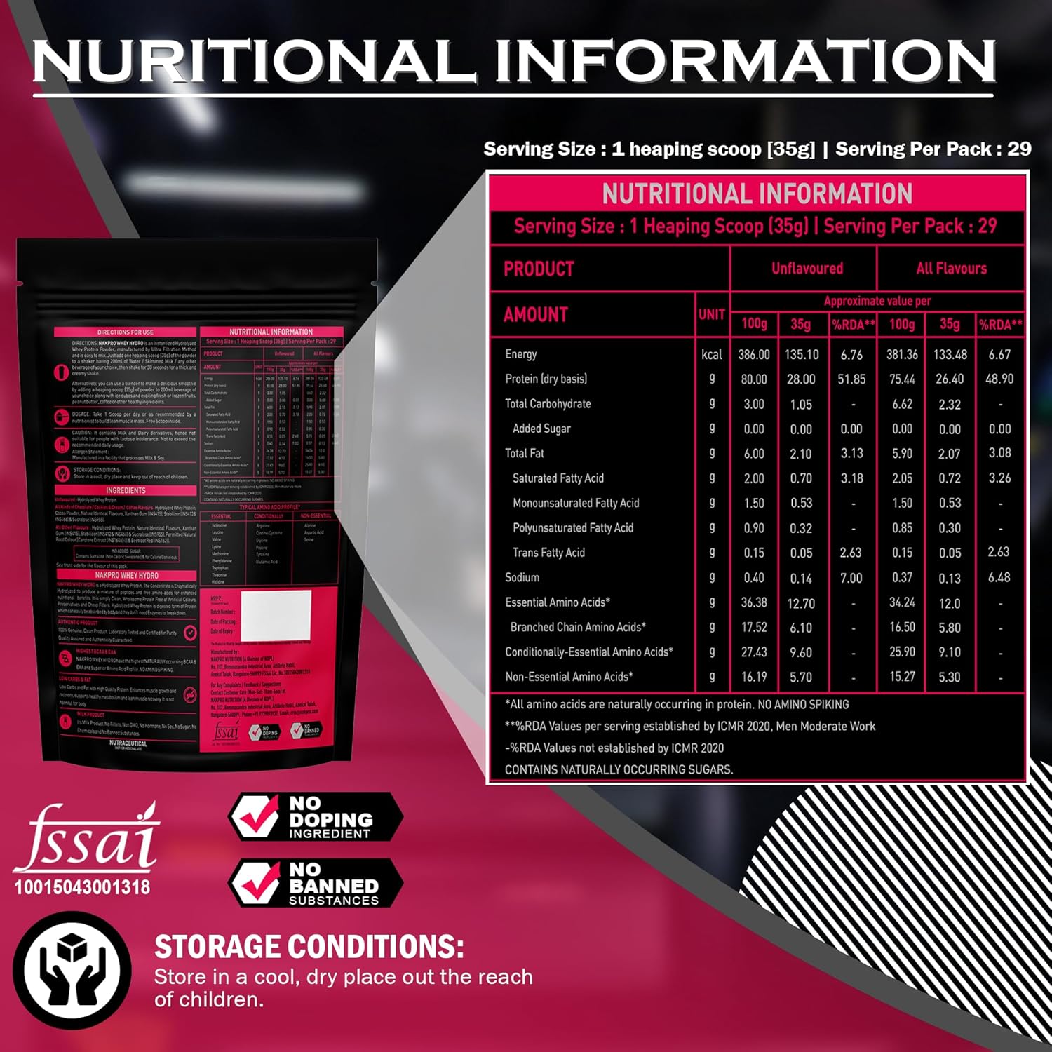 Nakpro Hydro Whey Protein contains Hydrolysed whey protein and contains 26.40g Protein in 35g serving size with 5.80g of BCAA and 12.0g of EAAs.