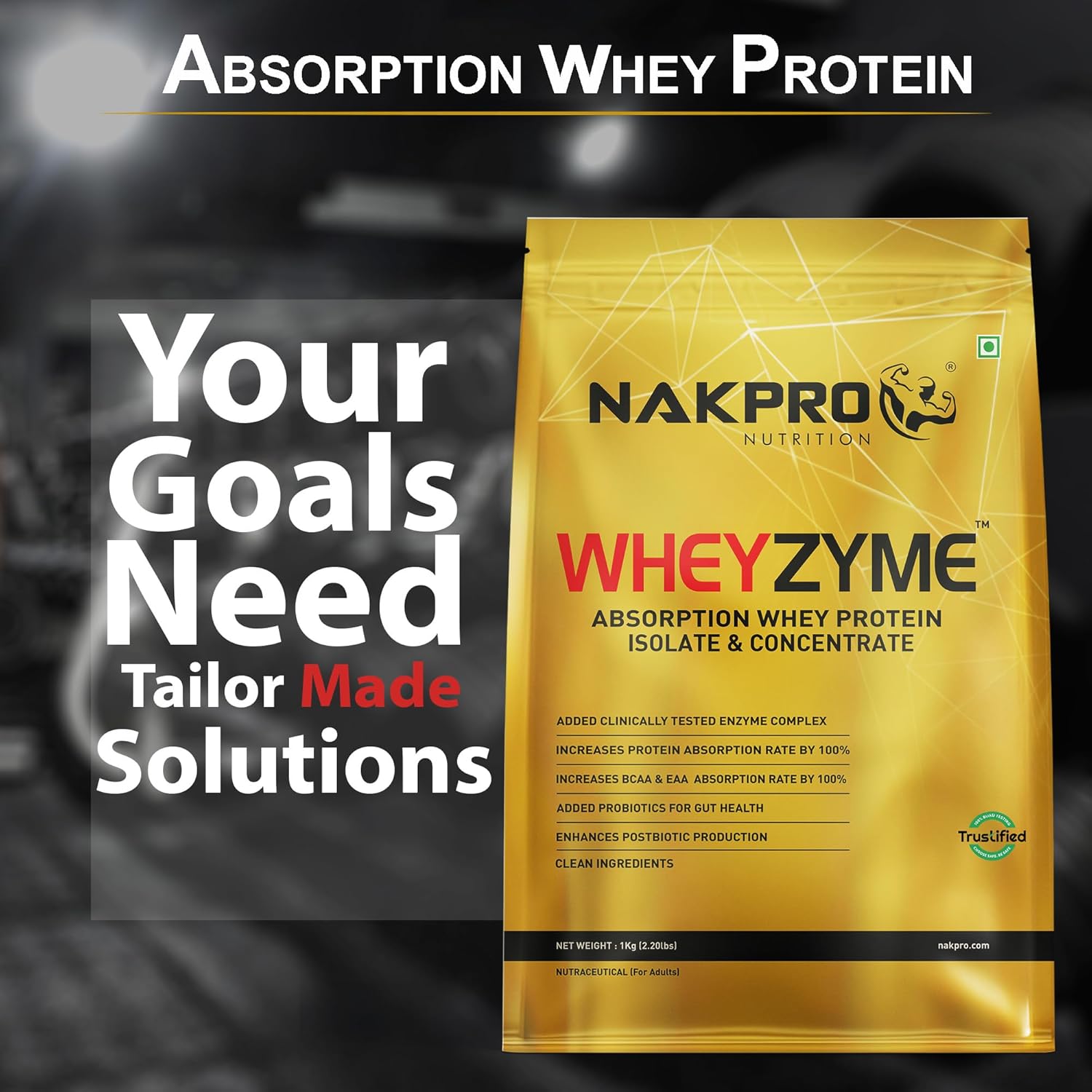 HIGH ABSORPTION FORMULA: Nakpro Wheyzyme Absorption whey protein is formulated to deliver maximum protein and amino acid absorption. Wheyzyme contains a powerful clinically proven protease enzyme complex which increases the absorption rate of whey protein by 50% compared to pure whey protein. Protease enzymes are proteolytic in nature that breakdown protein into smaller fragments and eases the digestion of protein.