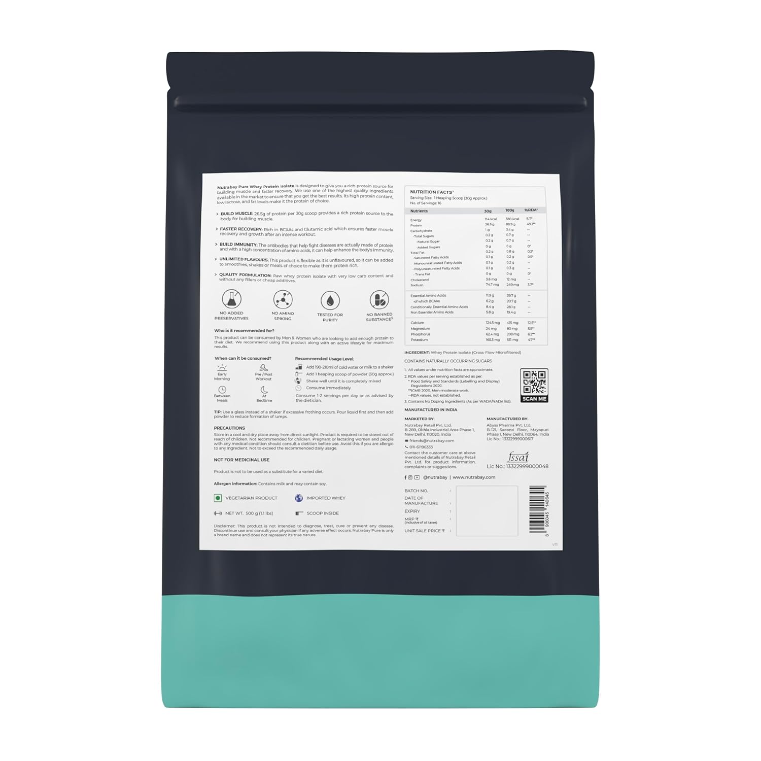Nutrabay Pure & Raw Whey Protein Isolate is unflavoured in nature, which gives you the freedom to add the flavor of your choice. No Amino Spiking, No Artificial Colour, No fillers, No Added Sugar, Gluten Free and No Banned Substances.