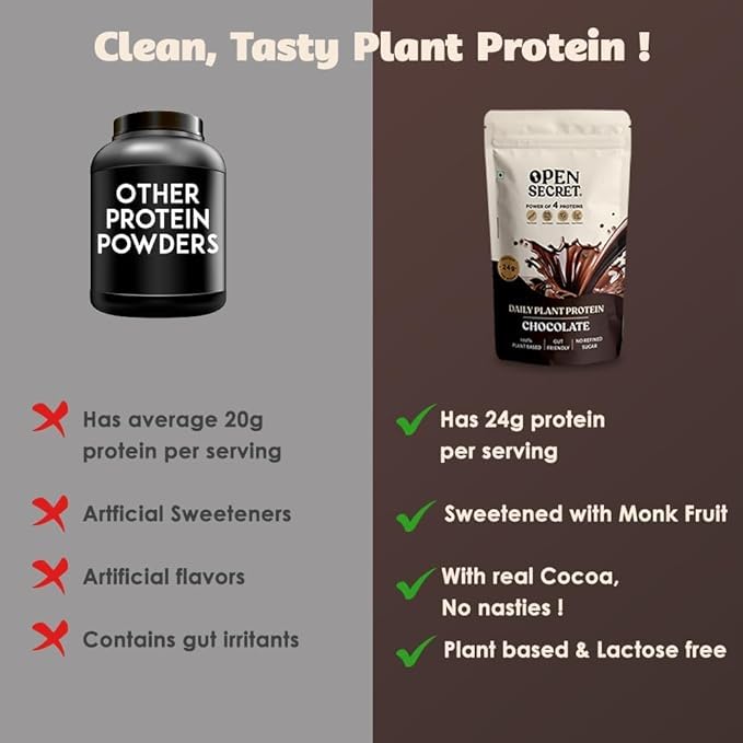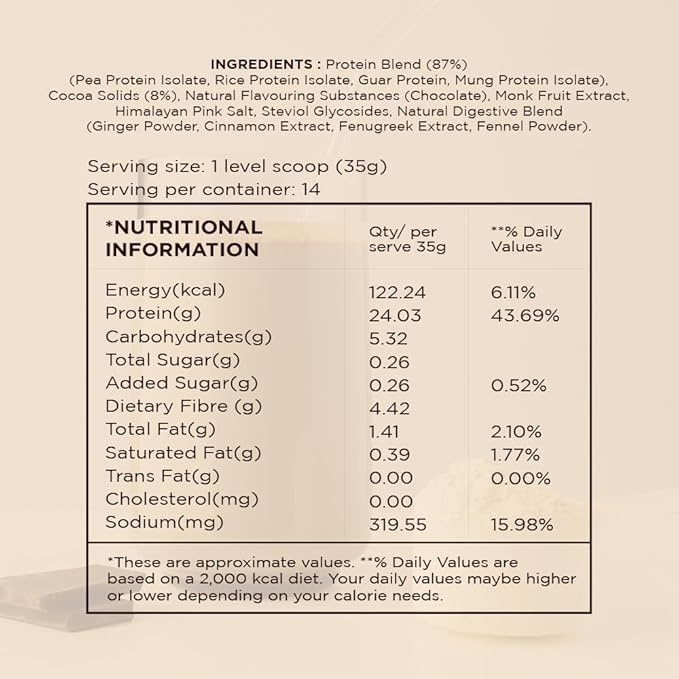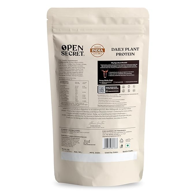 Fuel Your Body the Clean Way – Plant-Based Protein with a Purpose Power up your day with a delicious, chocolate-flavored plant-based protein blend that does more than just support your workouts. Our unique formula is powered by four high-quality protein sources—moong, rice, guar, and peas—to deliver a complete amino acid profile for optimal muscle growth, recovery, and endurance. Whether you’re looking to build lean muscle, manage weight by curbing cravings, or simply give your body the clean nutrition it deserves, this 100% vegetarian protein has you covered. Best of all, it’s made with no added preservatives and crafted for indulgence without compromise. But it’s not just about fitness—our protein also supports overall wellness by helping promote healthy skin, shiny hair, and stronger nails. It’s the perfect daily supplement for those who want to look and feel their best, inside and out. Key Benefits: Powered by moong, rice, guar, and peas for complete plant-based protein Rich chocolate flavor with no added preservatives Helps reduce cravings and supports weight management Promotes muscle recovery, endurance, and performance Supports skin, hair, and nail health Clean. Effective. Delicious. Take your health goals to the next level—one scoop at a time.