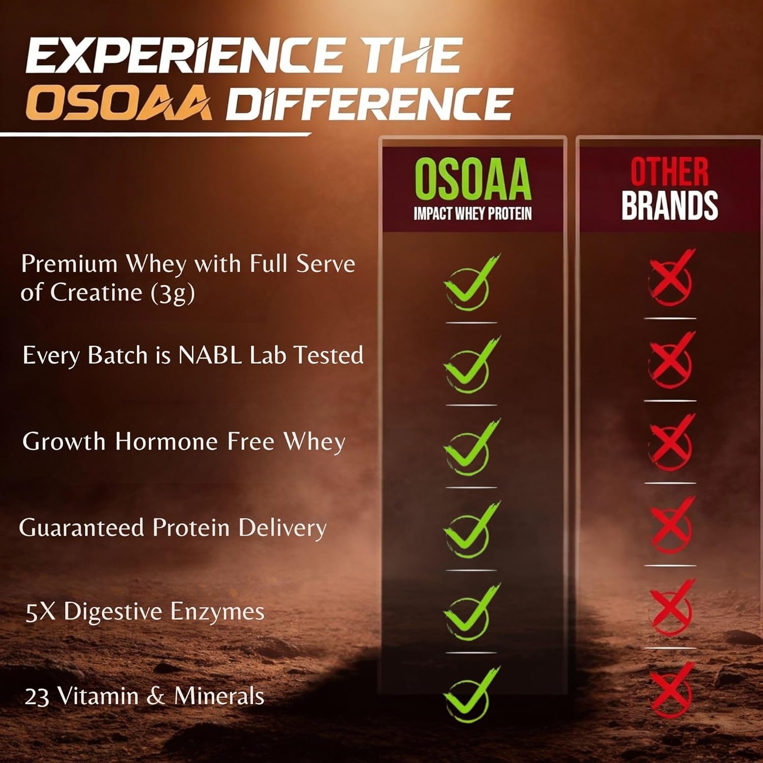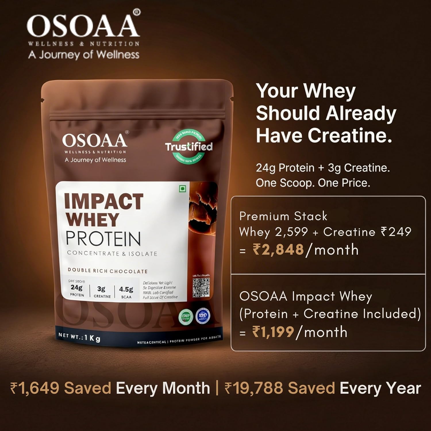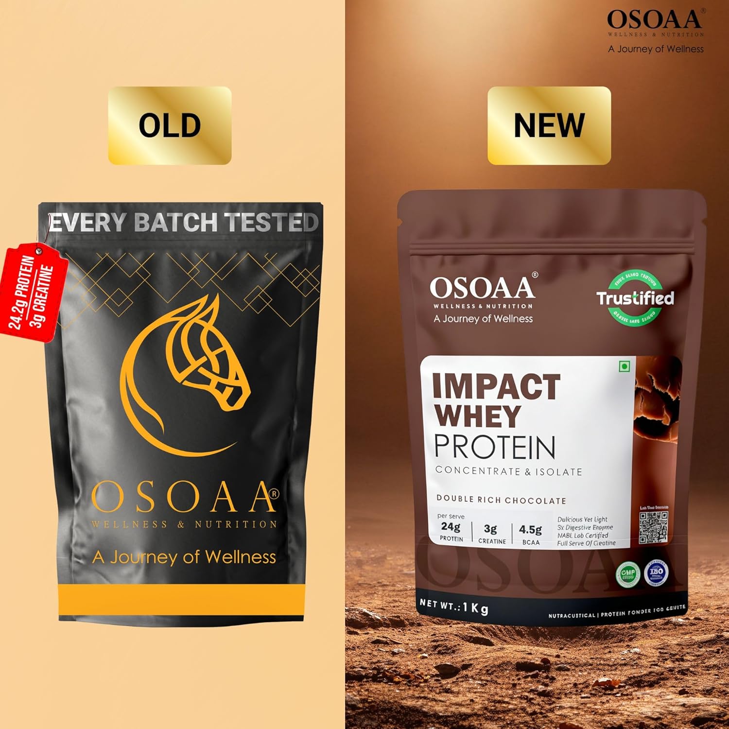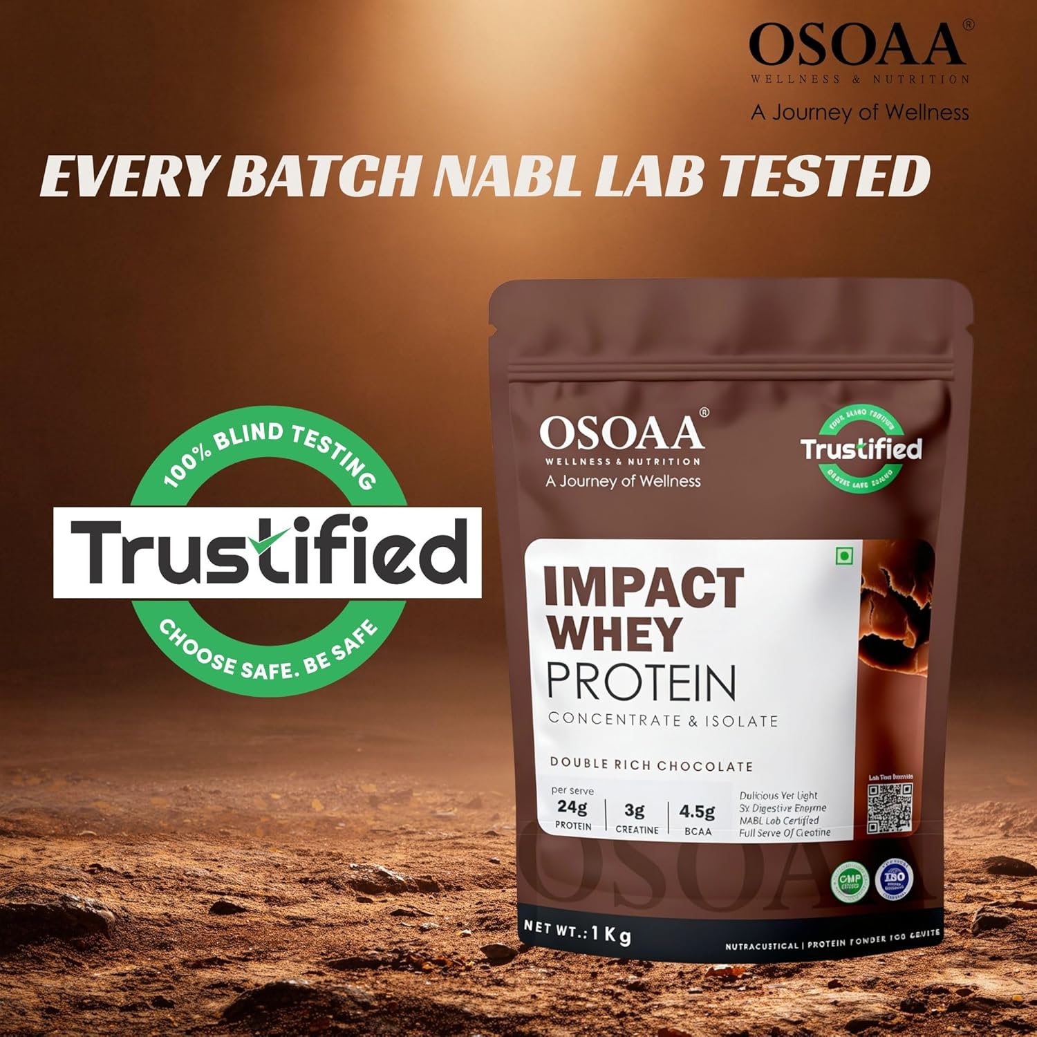 Osoaa Impact Whey Protein 1kg -Double Rich Chocolate | Isolate & Concentrate | 24g Protein & 3g Creatine with 5X Digestive Enzymes | Trustified Certified & NABL Lab Tested