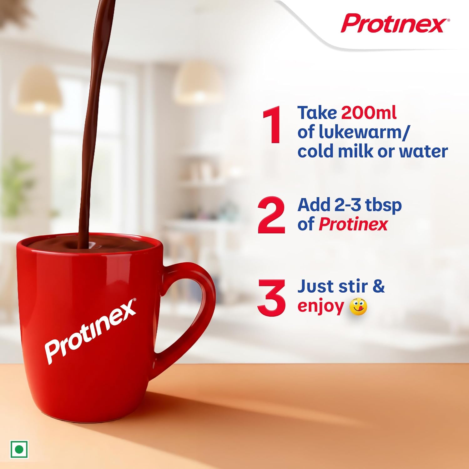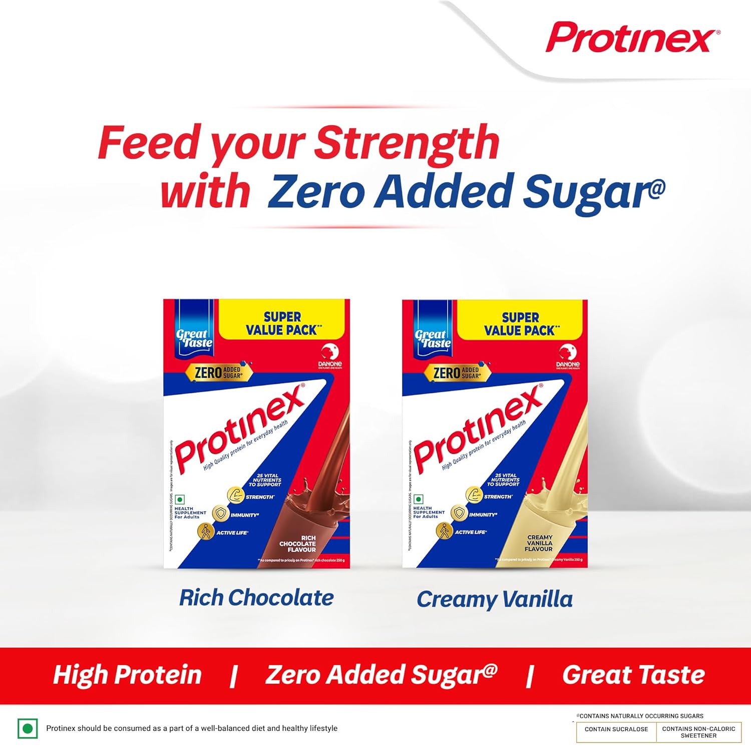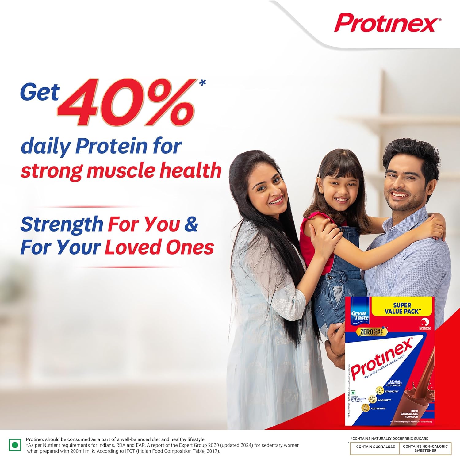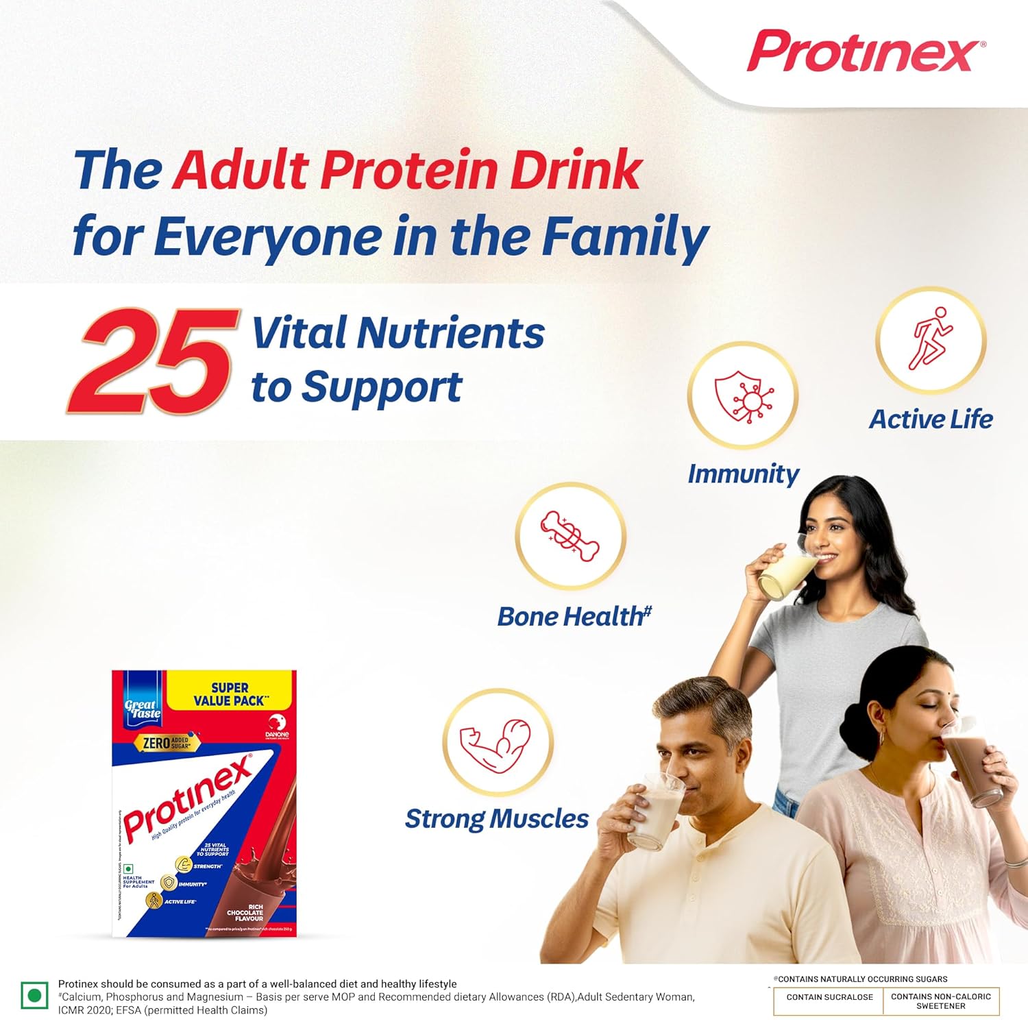 Protein makes up about 50% of muscles & bones in our body and our body cannot store protein – hence it needs to be consumed daily! Lack of protein leads to loss of muscle strength which in turn leads to frequent tiredness and fatigues in our daily lives. Protinex helps in bridging this gap of protein and other essential nutrients in regular Indian Adult diets. With a rich legacy of over 60+ years, Protinex comes with high protein content (34g for every 100g) that helps you fight tiredness + fatigue and delights you with its rich, creamy taste! Protinex should be consumed daily as part of a healthy lifestyle for everyday health. Protinex Tasty Chocolate is also enriched with calcium, vitamin D, and immuno-nutrients for your everyday health helping with stronger muscles & bones, long-term immunity and stamina to power through each day.