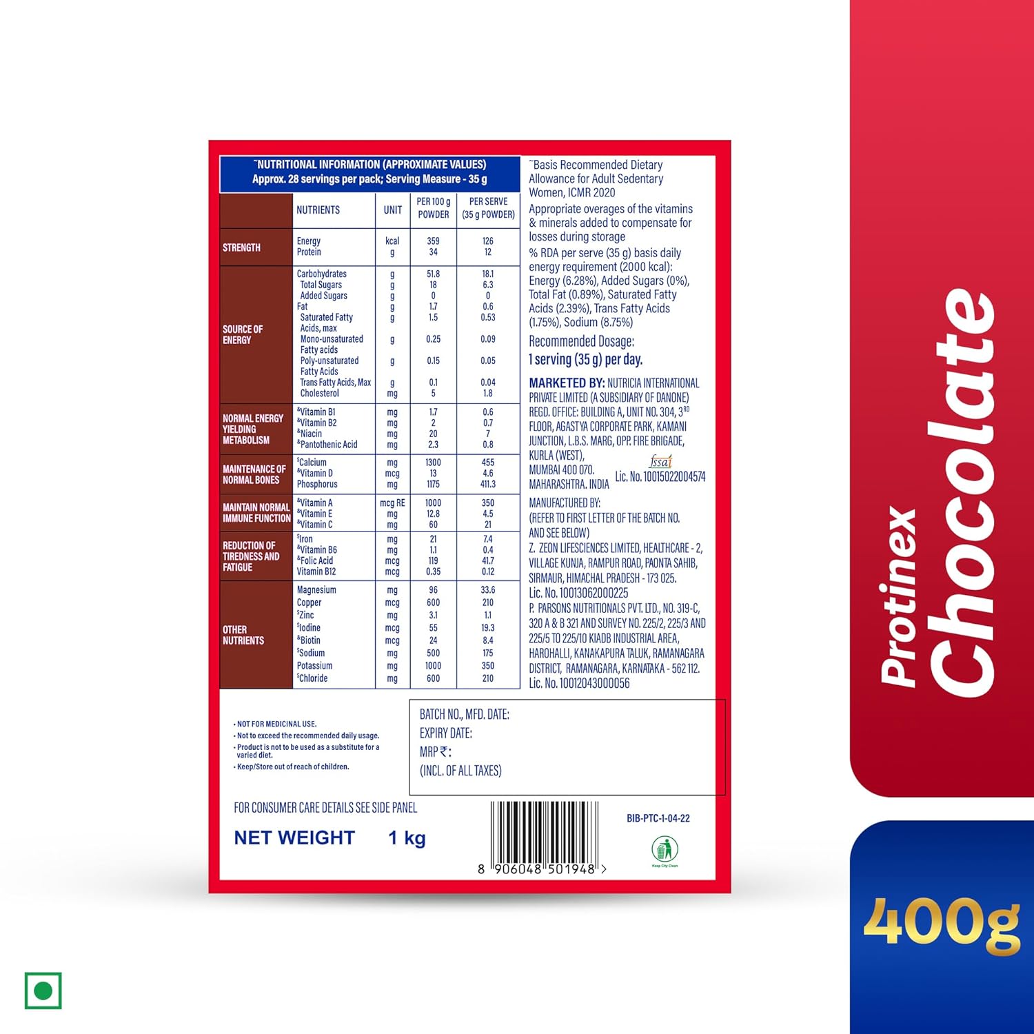 Importer : Nutricia International Pvt Ltd., Nutricia International Private Limited, Building A, Unit No 304, 3rd Floor, Agastya Corporate Park, Kamani Junction, LBS Marg, Opp. Fire Brigade, Kurla(West), Mumbai 400070