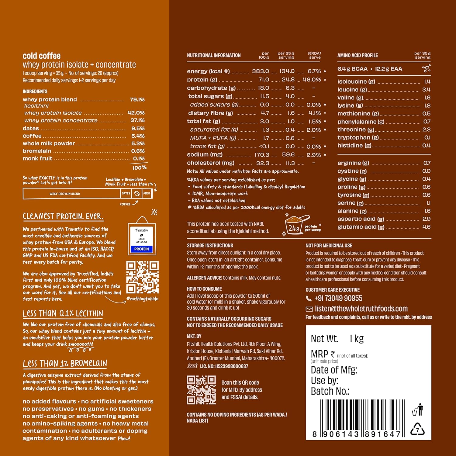 Trustified gold certified: India’s first and only 100% blind testing agency certifies The Whole Truth protein powder for accuracy of label claims (precise protein content, no amino spiking) and purity (free from heavy metals or biological contaminants).