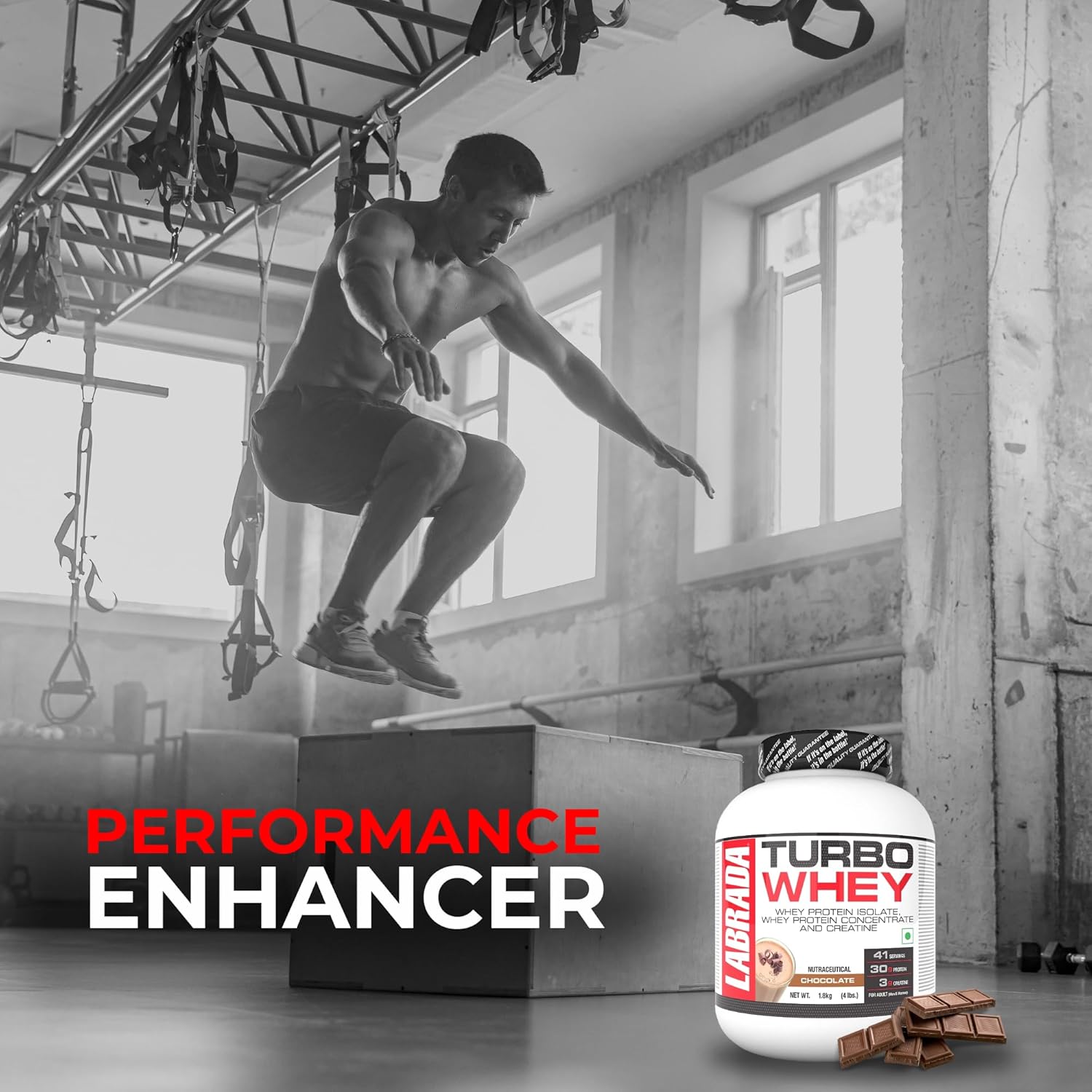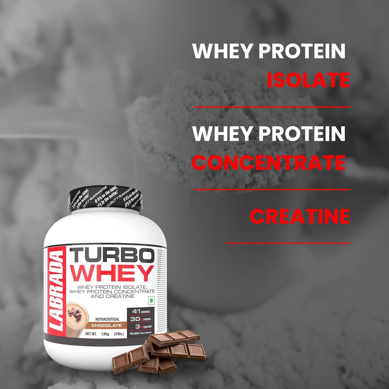 Labrada TURBO WHEY packs 30g of protein and 3g performance enhancing creatine per serving and is an excellent source of all the essential amino acids, including the branched chain amino acids (BCAAs) to provide support for muscle tissue; and glutamine, to promote recovery from exercise.